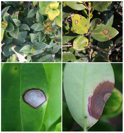 - Wang, S.H.; Liu, S.M. First Report of leaf spot caused by Pseudocercospora ligustri on Ligustrum japonicum ‘Howardii’ in China. Plant Dis. 2019, 103, 153. [Google Scholar] [CrossRef]