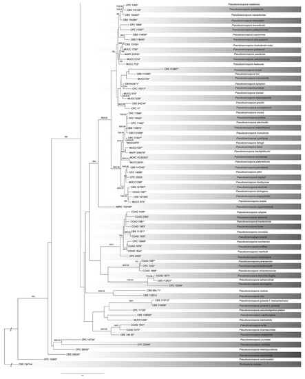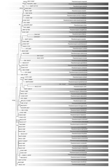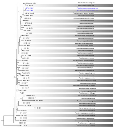 - Crous, P.W.; Braun, U.; Hunter, G.C.; Wingfield, M.; Verkley, G.; Shin, H.-D.; Nakashima, C.; Groenewald, J. Phylogenetic lineages in Pseudocercospora. Stud. Mycol. 2013, 75, 37–114. [Google Scholar] [CrossRef] [PubMed]