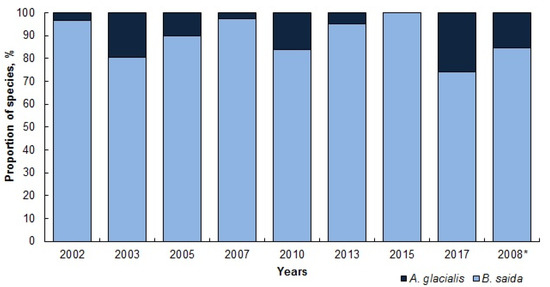 The overall proportional biomass in catches revealed by the cryopelagic fishes, ice cod Arctocgadus glacialis and polar cod Boreogadus saida in Northeast Greenland waters. * Note, the year 2008 represents only one station near Jan Mayen Island (Figure 3), and in 2015, only the shelf was sampled. The number of fjord and shelf stations is shown in Table 1.