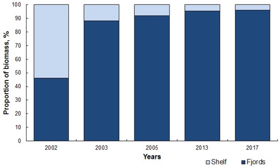 Throughout our investigation period, the proportional biomass of ice cod was strikingly higher in fjord compared to shelf stations, except for the year 2002, where catches were similar for the two cryopelagic cod fishes (Figure 4). This indicates that ice cod selects secluded habitats such as the sill fjords along the Northeast Greenland coast rather than the open continental shelf. Moreover, there was also a gradual proportional decrease in shelf catches of ice cod over years from 11.7% in 2003 to 3.8% in 2017 (Figure 4). This coincides well with the ongoing warming reported for Northeast Greenland, where waters of Atlantic origin deflect onto the continental shelf via the West Spitsbergen Current [30].