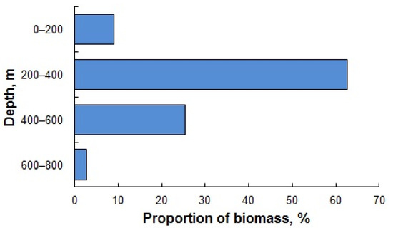 The depth of bottom trawl catches with ice cod varied between 98 m and 769 m. The highest proportional biomass of ice cod (62.6%) was encountered at depths 200–400 m, and up to 88% of the biomass was found within the 200–600 m layer (Figure 6). This corresponds well with the bottom depth of the subzero sill fjords along the Northeast Greenland coast. Similar data were obtained also for other areas in the European Arctic [12].