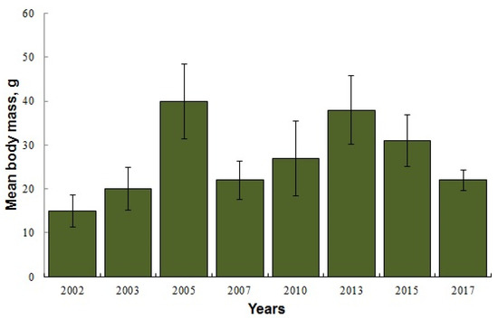 Overall, larger ice cod were caught in 2005 and 2013 and smaller ones in 2002, but with large interannual fluctuations in mean body mass, ranging from about 15 g in 2002 to 40 g in 2005 (Figure 7). The mean body mass of ice cod was 24 ± 2 g across all stations and tended to be slightly higher (27 ± 3 g) in the fjords and lower (19 ± 2 g) on the shelf.