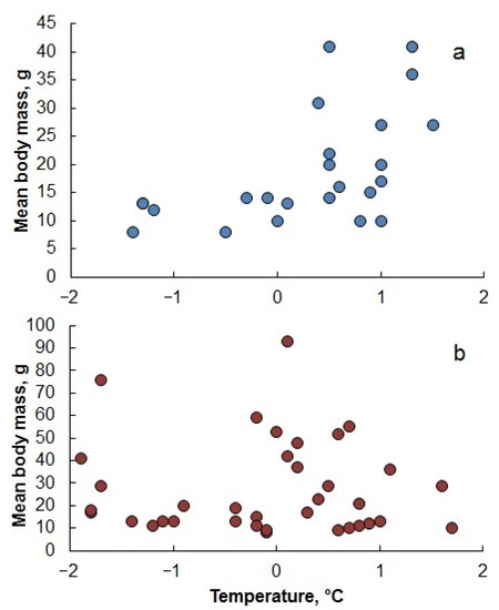 In conclusion, the occurrence of different-sized ice cod across stations suggests little spatial size segregation, although the smaller specimens with a body mass < 15 g prevailed in subzero waters (Figure 8a).
