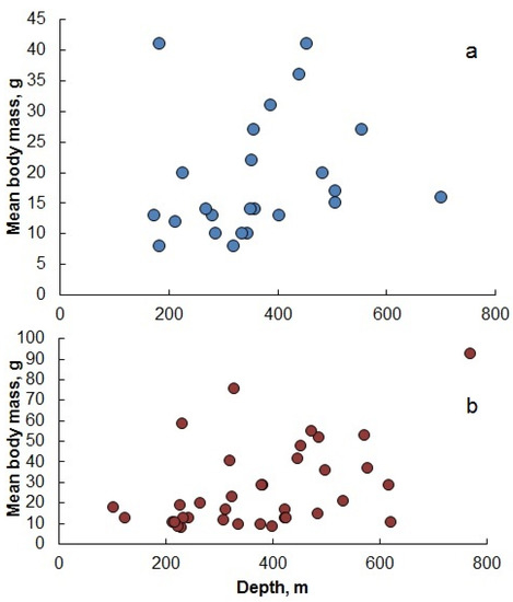 The mean body mass of ice cod with depth of sampling revealed no trend, and all size groups appeared evenly distributed throughout the entire depth interval irrespective of habitat (Figure 9a,b).