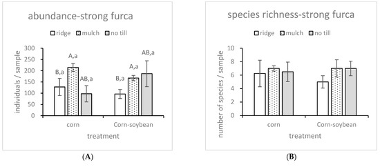 3.2. Different Responses of Species Richness and Abundances of Two Collembola Groups (Strong Furca and Weak Furca) to Different Tillage Types and Rotation Types