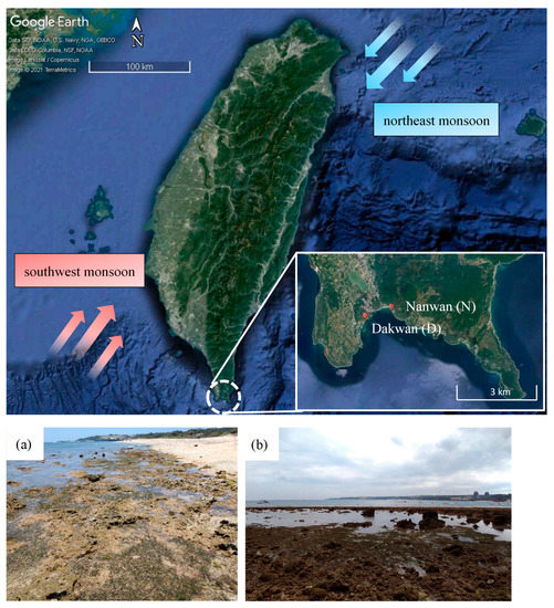 There were two study sites, the high-elevation site Dakwan (21.95038, 120.74888) and the low-elevation site Nanwan (21.95646, 120.76826), located in the intertidal fringing reef platforms of Nanwan Bay, southern Taiwan (Figure 1). The air temperature was higher in summer (mean: 28.7 °C) and lower in winter (mean: 22.1 °C) (https://e-service.cwb.gov.tw/HistoryDataQuery/ accessed 11 July 2022). Monthly precipitation was also higher in summer (548 mm) and lower in winter (42 mm). The wind speed was faster in winter (mean: 5.5 m/s) during the northeast monsoon and slower in summer during the southwest monsoon (mean: 2.0 m/s).