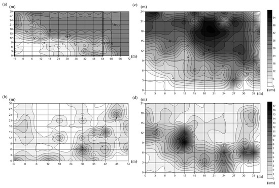 (a) Water depth (cm) and (b) sediment depth (cm) in the seagrass bed of Dakwan during a low tide. (c) Water depth (cm) and (d) sediment depth (cm) in the seagrass bed of Nanwan during a low tide. The x-axis was the distance (m) from the fixed transect (#0), and the y-axis was the distance from the coast.
