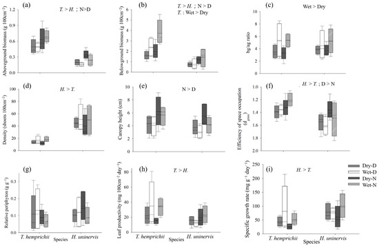 Seagrasses in shallow water have to cope with drought, high irradiances and temperatures [44]. In this study, T. hemprichii was more dominant in the seagrass beds because it is more resistant to drought than H. uninervis [39]. The dominance of H. uninervis in the water >18 cm deep likely stems from its faster growth rates and its ability to effectively compete for space [39]. The wet season is characterized by higher temperatures, precipitation levels and seawater DIN concentrations, which can increase the leaf and belowground production of both seagrass species [6,8,20]. Consequently, the cover area of both seagrass species increased in the wet season, which supports our hypothesis that both seagrass species will respond positively to warming and increased precipitation. However, the specific growth rate of H. uninervis is faster than that of T. hemprichii. The rhizome productivity of H. uninervis is even 5 times higher than that of T. hemprichii [8]. The turnover rates of both aboveground and belowground parts of H. uninervis are higher than those of T. hemprichii [8], so that H. uninervis is capable of expanding more space than T. hemprichii.