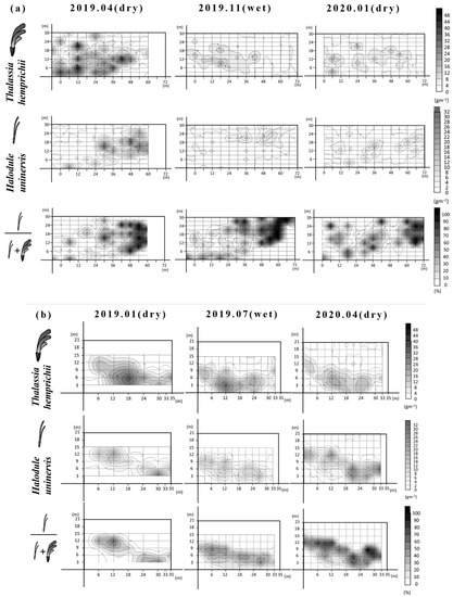 The dominant area of seagrass species indicated the area where the seagrass species contributed > 50% of the total biomass in the seagrass beds. T. hemprichii was the dominant species at both sites year-round as the percentage of the dominant area was >72% (Table 2). However, the distribution of both species in the seagrass bed of Dakwan was distinct (Figure 4a). The distribution of H. uninervis was dominant in the water > 18 cm deep, whereas the distribution of T. hemprichii was dominant in the water < 12 cm deep. There was a clear seasonal succession in the community structure of seagrass beds. The dominance of H. uninervis moved to shallower water in the wet season and then moved back to deeper water in the dry season.