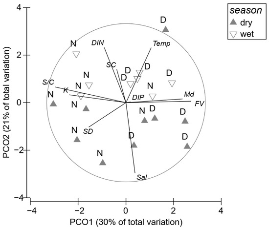 PCoA of the environmental factors measured in Dakwan (D) and Nanwan (N) in the dry and wet seasons. Temp: seawater temperature; Sal: seawater salinity; DIN: dissolved inorganic nitrogen concentration; DIP: dissolved inorganic phosphorus; K: light extinction coefficient; FV: seawater flow velocity; SD: sediment depth; Md: sediment grain size; S/C: sediment silt/clay content (%); SC: sorting coefficient.