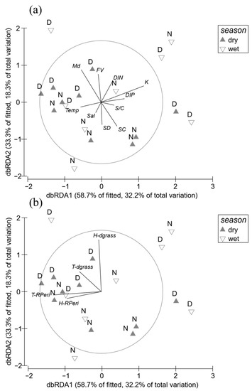 dbRDA plots showing the relationships between (a) environmental factors, (b) efficiency of space occupation (dgrass) and relative periphyton biomass (RPeri) and seagrass variables (Thalassia hemprichii and Halodule uninervis) measured in Dakwan (D) and Nanwan (N) in the dry and wet seasons. Temp: seawater temperature; Sal: seawater salinity; DIN: dissolved inorganic nitrogen concentration; DIP: dissolved inorganic phosphorus concentration; K: light extinction coefficient; FV: seawater flow velocity; SD: sediment depth; Md: sediment grain size; S/C: silt/clay content (%); and SC: sorting coefficient.