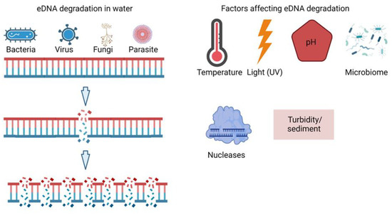 A range of factors, including light, temperature, enzymatic activity, and pH impact the breakdown of eDNA (Figure 2). Addressing eDNA detection in an aquatic environment requires a full understanding of these factors and interactions, and the effects they have on eDNA stability. Hence, The factors influencing DNA persistence into three groups: the DNA molecule’s properties, abiotic factors (light, substrates, pH, oxygen, salinity), and biotic factors (microbes and enzymes) [42]. The length, conformations, and whether a DNA molecule is membrane-enclosed or free (also known as “naked”) DNA are all properties of the DNA molecule that affect how quickly DNA breaks down in the environment [43,44,45]. Biotic and abiotic factors affecting DNA degradation in an aquatic environment are discussed below.