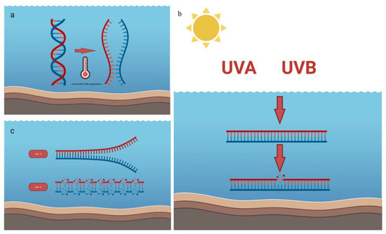 DNA deterioration in water occurs more quickly than in soil and sediments, possibly because of increased enzymatic and microbial activity at higher temperatures [46]. According to Matsui, et al., (2001) who investigated the fate of dissolved DNA in a thermally stratified lake, DNA in the warmer epilimnion (upper layer) was destroyed completely in 170 hours, while degrading more slowly in the much cooler hypolimnion (lower layer). In contrast to samples exposed to the full sun for 18 days and those exposed to 20% shade for 18 days, Idaho giant salamander eDNA stored at 4 °C and no light for 18 days contained 2030 and 733 times more eDNA, respectively [46]. Similarly, the experiment carried out by Zulkefil, et al., (2019) found higher degradation of eDNA at 35 °C compared to the control at 5 °C, which was about 60% from the initial concentration [47]. Likewise, the experiment carried out by Tsuji, et al., (2017) to know about the eDNA degradation of two species, ayu sweetfish (Plecoglossus altivelis altivelis) and common carp (Cyprinus carpio), at seven-time points, over a 48-h period, and at three different water temperatures (10 °C, 20 °C, 30 °C), found higher degradation at 30 °C. Some studies have found no effect of temperature on eDNA shedding rate [48,49]. Contrarily, Robson, et al., (2016) discovered that Mozambique tilapia’s DNA shedding rate was dramatically increased by tropical temperatures (23, 29, and 35 °C) (Oreochromis mossambicus) [50]. Inconsistencies in the research findings could point to variations in eDNA production that are species-specific. Higher temperature often leads to degradation by double-strand break of DNA (Figure 3a).