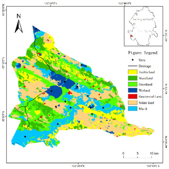 The Xianghai Reserve is located in Tongyu of Jilin Province (Figure 1) (122°5′~122°31′ E, 44°55′~45°09′ N) and has a total area of 1050 km2. This reserve was included in the first group of sites on the List of Wetlands of International Importance in China in 1992. The reserve is an important stopover site for migratory waterbirds and a breeding place for summer migratory birds in the Asia-Pacific region. The main objects of protection include birds (e.g., Grus japonensis and Ciconia boyciana) and their habitats [6]. The reserve is situated in a semiarid area with the continental monsoon climate of the northern temperate zone. Most rainfall occurs in summer. The average annual precipitation is approximately 370 mm, and the average annual evaporation is approximately 1890 mm [7].