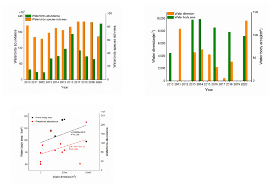 We analyzed the annual dynamics of the waterbird community in the Xianghai Reserve from 2010 to 2020 based on the number of species and individuals for 10 orders (Figure 2). The results showed that the number of waterbird species decreased in the study area from 2010 to 2012, increased from 2013, reached a maximum number of species in 2018, and then showed a decreasing trend. The number of waterbird individuals showed the same decreasing trend as the number of species from 2010 to 2012, increased annually from 2013 to 2016, decreased annually from 2016 to 2019, and suddenly reached a maximum in 2020. The change of regional water diversions influenced waterbird abundance and water body area in the reserve. At the beginning of the restoration measures, the water body area reached a maximum number, and then showed a decreasing trend year by year. We investigated the differences in water diversion on waterbird abundance and water body area through employing regression mode, which has a positive correlation with interannual water diversion. When the water diversion maintained at 5.00 × 107 m3, the waterbird abundance was at a stable level.