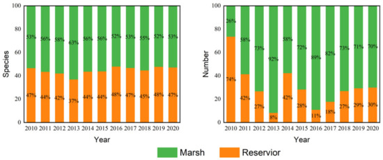 The number of waterbirds in the reservoir habitat was higher than that in the marsh habitat in 2010 (Figure 3). The proportion of waterbirds in the marsh habitat continued to increase from 2011 to 2013 and reached a maximum (92%) in 2013. The proportion of waterbirds in the marsh habitat fluctuated in other years, but overall, it was higher than that in the reservoir habitat.