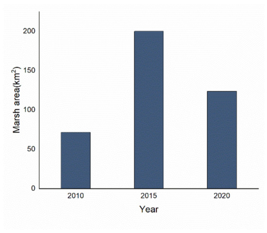 The number of waterbird species in marsh habitats was consistently higher than that in the lake reservoir habitats from 2010 to 2020 in the Xianghai Reserve (Figure 3). Since 2012, restoration measures have been carried out in the study area. At the beginning of the restoration measures, the area of marsh habitat increased significantly. In the middle of the restoration measures, the area of marsh habitat showed a decreasing trend (Figure 4). With the increase in the marsh habitats, the proportion of waterbird species in marsh habitats continued to increase from 2010 to 2013 and reached a maximum (63%) in 2013. The proportion of species in marsh habitats decreased from 2016 to 2017 and from 2019 to 2020, which has a similar trend in marsh habitats change.