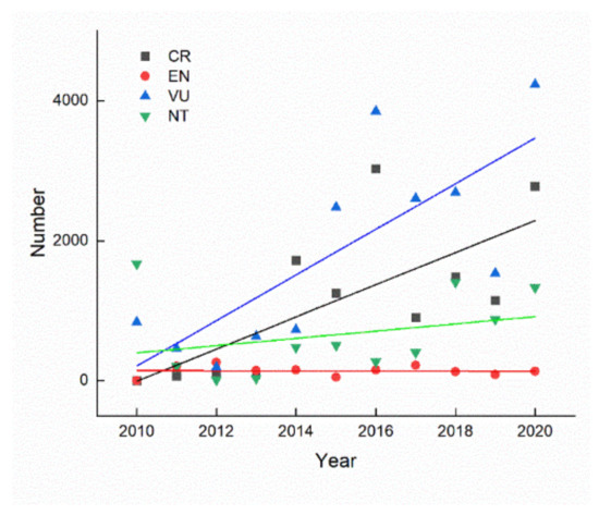 We investigated the contact between the IUCN Red List of Threatened Species and time through employing regression models (Figure 5). The proportion of dependent variable (Y) impacts on independent variables (X) was explained by linear regression, which indicated the number of protected birds increased year by year after the restoration measures in 2012. In the Xianghai Nature Reserve, only the endangered waterbirds showed a decreasing trend. Critically endangered waterbirds, vulnerable waterbirds, and near threatened waterbirds showed the same trend, with their numbers increasing year by year. The number of vulnerable waterbirds changed more dramatically than the other two categories.