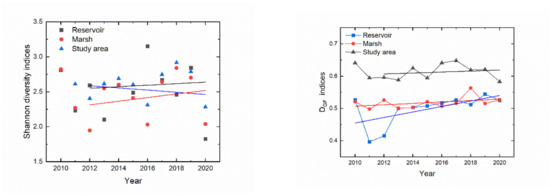 The interannual variations of in the reservoir and marsh habitats of the Xianghai Reserve from 2010 to 2020 are shown in Figure 6. In the marsh habitat, the indices of showed overall increasing trends and reached their maximum values in 2018 ( = 0.56). In the reservoir habitat, the indices of decreased from 2010 to 2012, showed an increasing trend from 2013, and reached their maximum value in 2019 ( = 0.54). In the study area, the index of was generally stable and maintained at 0.58~0.65 in all years. After the restoration measures in 2012, the overall trend was rising.