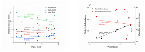 The correlations of waterbird abundance, waterbird species richness, and Shannon-Wiener indices of different types of waterbirds to water level fluctuations were analyzed during 2010–2020 (Figure 7). Waterbird abundance showed a positive correlation with the water level, and the wetland replenishment in the reserve promoted the increase of waterbird populations. Waterbird species richness is negatively correlated with the water level, and when the water level is too high it has a negative effect on waterbird species richness in the reserve. Waterbird abundance and species richness in the study area were maintained at relatively high levels when the water level was maintained at about 2 m.