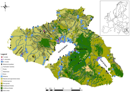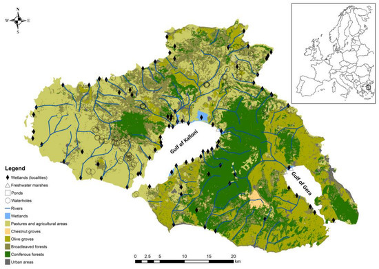Lesvos, the third-largest island of Greece, located in the north-eastern Aegean Sea, is a natural bio-laboratory [70], with an area of 1632.8 km2, and a large number of wetlands of all types [71]. The island encompasses 85 officially mapped and protected [Presidential Decree (Government Gazette 229/AAΠ/2012)] wetlands, both natural and artificial, with a total area of 13.77 km2, which ranks it second among the Aegean islands, after Crete. The island is hilly with a maximum altitude of 968 m (Mt. Lepetymnos). The eastern and southern parts of the island are covered mainly by traditional olive groves (Olea europaea), while in its central part extensive areas of continuous and homogeneous pine forests (Pinus brutia) are found. In the western and northern parts of the island shrubby vegetation and phrygana grows along with oak tree patches (Figure 1). Due to its large size, Lesvos hosts a high number of biota, while its diversity is much influenced by the east due to its vicinity to Asia Minor, thus constituting an island where Anatolian species meet with the Mediterranean ones. This promotes the existence of a variety of terrestrial, aquatic, and semi-aquatic herpetofauna species. The island’s climate is Mediterranean, characterized by cool-moist winters with a mean temperature of 9.6 °C in January, and warm-dry summers with a mean temperature of 27.0 °C in July (Mytilene airport) [72]. The mean annual rainfall varies from 725 mm in the east to 415 mm in the west of the island, with little or no rain between May and September [73].