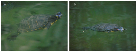 - Urošević, A. An invaded natural monument: Two species of alien terrapins, Trachemys scripta (Thunberg in Schoepff, 1792) and Pseudemys floridana (Le Conte, 1830) (Testudines: Emydidae ), in Lake Mavrobara, Greece. Acta Zool. bulg. 2022, 74, 487–491. [Google Scholar]
