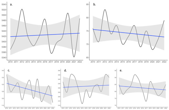 Population fluctuations and trends of the two native terrapins on the island of Lesvos: (a) M. rivulata, (b) E. orbicularis, (c) M. rivulata in the Vouvaris river, (d) M. rivulata in the Skala Eresou river, and (e) M. rivulata in the Skalochori pond; The blue line indicates the population trend based on the Poisson distribution and the shaded area represents the confidence intervals. In all cases, the native terrapin populations have remained stable throughout the years. It is worth mentioning that there was no E. orbicularis in the Vouvaris river, nor in the Skala Eresou river. In the Skalochori pond, there was one individual which we observed during the 2019 and later surveys.