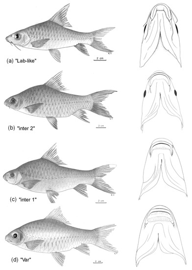 - Levin, B.A.; Casal-López, M.; Simonov, E.; Dgebuadze, Y.Y.; Mugue, N.S.; Tiunov, A.V.; Doadrio Golubtsov, A.S. Adaptive radiation of barbs of the genus Labeobarbus (Cyprinidae) in an East African river. Freshw. Biol. 2019, 64, 1721–1736. [Google Scholar] [CrossRef]