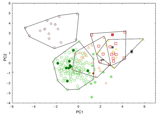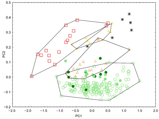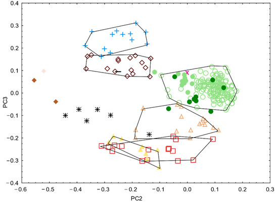 The “Lab/Var”-complex displayed similar patterns as for the meristics: “Lab-like” and “Var” were completely separated (on PC3); “inter2” occupied a position in-between both, while “inter1” overlapped almost entirely with “Var”.