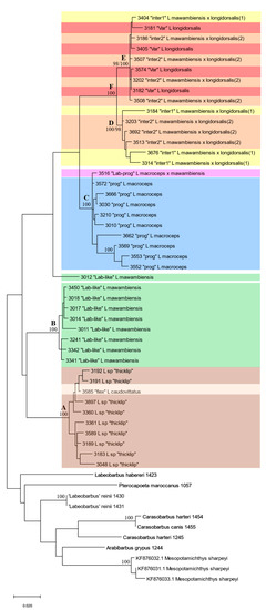 A single specimen, “Lab-prog”, was found with an intermediate overall morphology between L. macroceps and L. mawambiensis. Additionally, in a PCA on the meristics (not illustrated), this specimen had a position in-between L. macroceps and L. mawambiensis, mainly due to an intermediate number of lateral line scales (29 vs. 31–36 and 21–28). In a PCA on measurements (Figure 4), it was located within the polygon of L. mawambiensis, but near to its margin. Based on the morphological results, this morphotype seems a putative hybrid between L. macroceps and L. mawambiensis. The clustering of this specimen with the clade of L. macroceps on the ML tree, then would indicate it having the maternal DNA of L. macroceps (Figure 6).