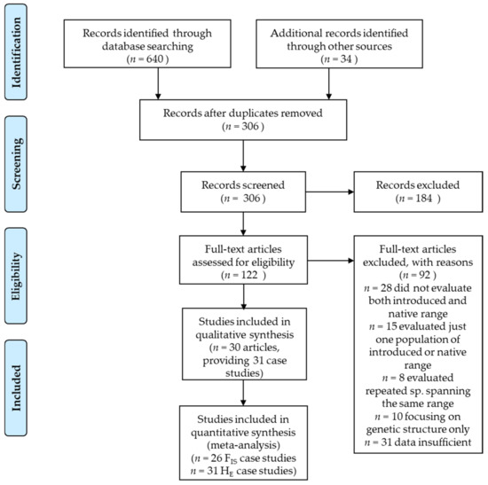 We searched for available scientific literature on invasive plant genetic diversity using a combination of the following keywords: invas * plants OR alien plants OR exotic plants OR introduced plants AND genetic diversity OR population genetic structure AND SSR OR microsatellite, in Web of Science, Scopus, Google Scholar, JSTOR, Wiley, and Science Direct databases. We chose studies that used microsatellite markers because they have been the most popular markers in the last decades in population genetic studies and to avoid marker bias by including other types of genetic markers [46]. The search was conducted from 1980 to 2021 and followed the PRISMA statement [47], which provides a standardized framework for meta-analysis and systematic reviews (Figure 1). To ensure that the gathered information was of high quality and that our results were replicable, we limited our search to peer-reviewed articles written in English. We excluded grey literature and previous reviews (which may duplicate the information). More than one study focused on these three species: Ambrosia artemisiifolia L. (Asteraceae), Spartina alterniflora Loisel. (Poaceae), and Acacia dealbata A. Cunn. (Fabaceae) and because the study sites were the same, we included only the articles reporting all information needed to fill out our inclusion criteria. Each evaluated species was considered a case study.