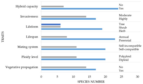Plant life-history traits can influence levels of genetic diversity in the invasive range and can be crucial to the success or failure of an invasion [10,21,22]. Reproductive systems are the main determinant of plant genetic diversity [23]. For instance, there is evidence that genetic diversity may be reduced in invaded ranges because of a change in reproductive strategies (e.g., clonality and selfing) [22]. Another factor determining genetic diversity in plants is the life form, with trees usually having traits that maintain high levels of genetic diversity compared to herbaceous plants [24]. Likewise, trees predominantly outcross, with a lower proportion of selfing than other life forms [25]. However, self-compatible trees sometimes exhibit high inbreeding, even if mixed, outcrossing, or predominantly selfing [26]. Low levels of inbreeding are also associated with perennial plants due to their longevity and overlapping generations [27]. In addition to life-history traits, interspecific hybridization and polyploidization (genome duplication) can influence genetic diversity [28,29]. Specifically, within a few generations, interspecific hybridization with native congeners may result in higher levels of standing genetic variation in the exotic population, thereby increasing its adaptive capacity in the new environment [19,30]. Additionally, polyploidization, which increases genome size, can prevent genetic erosion during the early stages of an invasion because polyploid genomes are less susceptible to drift [29,31].