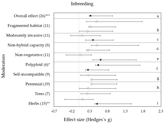 Effect sizes on inbreeding: (a) overall effect, (b) habitat condition, (c) invasiveness, (d) hybrid capacity, (e) vegetative propagation, (f) ploidy level, (g) mating systems, (h) lifespan, (i) life form (mean and 95% CI; numbers in parentheses represent sample size; * p < 0.05, ** p < 0.01, *** p < 0.001; not significant, p ≥ 0.05). Black dots represent a significant effect on inbreeding.