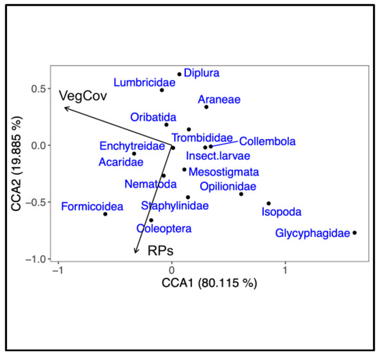 The global CCA model was significant (p < 0.001) and selected VegCovr and RPs as meaningful explanatory variables. The majority of explained variation was attributed to the first axis, with only the first canonical axis being significant (first axis F = 6.573, p < 0.001; second axis F = 1.632, p = 0.128). The first axis accounted for 80.115% and the second for 19.885% of the total variation, respectively, and both explained 9.652% of the total inertia in the overall data. The biplot graphical representation indicated that the Glycyphagidae, Isopoda and Opiliones were the most negatively correlated taxa with the VegCovr, while the Formicoidae and Acaridae were the most positively correlated taxa with VegCovr. The Diplura, Lumbricidae and Aranea were the most negatively correlated taxa with RPs and the Coleoptera, Formicoidae and Staphylinidae were the most positively correlated taxa with RPs (Figure 1).
