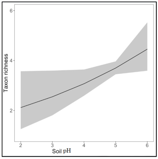 The effect of soil pH on treatment on taxon richness. In grey are the confidence intervals.