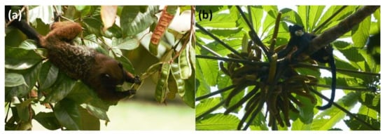 - Link, A.; Di Fiore, A. Seed dispersal by spider monkeys and its importance in the maintenance of neotropical rain-forest diversity. J. Trop. Ecol. 2006, 22, 235–246. [Google Scholar] [CrossRef]