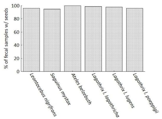 - González, M.; Stevenson, P.R. Seed dispersal by woolly monkeys (Lagothrix lagothricha) at Caparú Biological Station (Colombia): Quantitative description and qualitative analysis. In The Woolly Monkey; Defler, T.R., Stevenson, P.R., Eds.; Springer: New York, NY, USA, 2014; pp. 147–165. [Google Scholar]