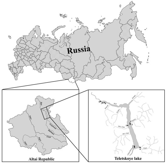 Samples from the Altai (Altai Republic) were included in this study (Figure 1, Table 1). The Altai samples were collected from Teletskoye Lake and the adjacent area on 27–29 May 2015. Teletskoye Lake is the deepest freshwater body in the southwest of Siberia. It is located in the northeast of the Altai Mountains at an altitude of 434 m above sea level. Part of the water body and its eastern coast are incorporated among the UNESCO World Heritage Sites as part of the “Golden Mountains of Altai” complex [26]. The lake has an elongated shape in the meridional direction, and is 78 km long with a maximum width of 5.2 km. The lake is quite large; its water area is 223 km2, and its volume is 40 km3. One of the unique characteristics of this lake is the sparse presence of shallow areas. The littoral area with depths up to 10 m is only 7.8% of the lake area, and the maximum depth is 325 m [27]. The catchment area is 19,500 km2, and most of this area has an average elevation of 1940 m, which ensures low mineralisation and organic matter concentrations in the lake. Among the 70 permanent tributaries, the Chulyshman River is the largest, accounting for 75% of the total inflow to the lake. The Biya River is almost the only outflow of Teletskoye Lake (98% of total water runoff) [28]. Teletskoye Lake is characterised by increased external water exchange, in which a complete change of water occurs every 5.81 years [29].