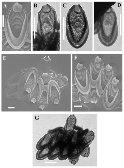Mallomonasaltaicasp. nov. (A) Body scale, SEM; (B–D) body scales, TEM; (E) group of scales, illustrating an upper surface and bottom surface view, SEM; (F) group of body scales at higher magnification, SEM; and (G) group of body scales, TEM. Scale bars: (B–D,G): 2 μm; (A,E,F): 1 μm.