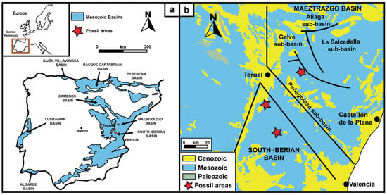(a) Location of the fossil areas studied. (b) Geological map of the studied region that shows the limits of the basins and the more detailed location of the fossils areas. Cartography modified from [].