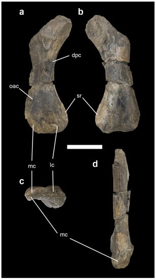 - The left humerus CT-61-1 (Figure 2) shows a robust and strongly expanded transversally distal region that demonstrates thyreophoran affinities [,]. Furthermore, the presence of a pronounced anteroproximal expansion of the lateral condyle and an oblique ridge on the anterior surface that extends from the deltopectoral crest to the medial condyle support stegosaurian affinities []. In comparison to other stegosaurs, CT-61-1 shows an oblique crest less pronounced than Stegosaurus (Plate 33 []) or Kentrosaurus (Figure 4b []), being more similar to Dacentrurus armatus (Plate 17 []; Figure 9a–e []) and ‘Miragaia’ (Figure S3 []).