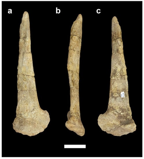 MPA D-110. Dermal spine from Puntal de la Magdalena fossil site (Alpuente, Valencia, Spain) in lateral (a), anterior (b) and medial (c) views. Scale bar = 5 cm.
