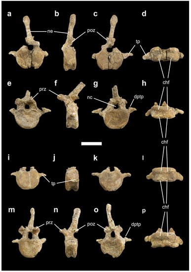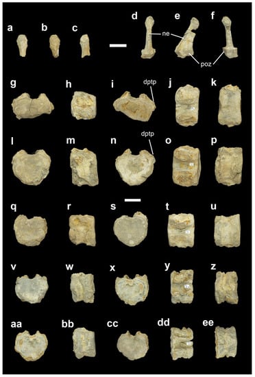 - MPA D-108 (Figure 4a–c) and MPA D-109 (Figure 4d–f) are two neural arch fragments. In particular, MPA D-108 consists of the apical region of a neural spine. The top of the neural spine has a circular morphology, and it is anteroposteriorly and mediolaterally expanded. Owing to these features, MPA D-108 belongs to the caudal series. On the other hand, MPA D-109 is an almost complete neural arch. The postzygapophyses are located above the prezygapophyses. The articulation surfaces of the postzygapophyses are anteroposteriorly directed and oval-shaped. With regard to the neural spine, it is short, and its lateral and medial surfaces are straight. The apex is anteroposteriorly and mediolaterally expanded and presents a circular morphology. Owing to the morphology of the postzygapophyses and the size of the postzygapophyses and the neural spine, we identified MPA D-109 as a middle caudal neural arch, more posterior than MPA D-108.MPA D-114 (Figure 4g–k), MPA D-111 (Figure 4l–p), MPA D-112 (Figure 4q–u), MPA D-115 (Figure 4v–z) and MPA D-113 (Figure 4aa–ee) are vertebral centra. MPA D-115 and MPA D-133 are contiguous vertebral centra. All centra are amphicoelous and wider than they are tall and long. As we move backward through the series, the centra tend to reduce their size, to become longer and to present a more marked heart-shaped morphology of the articulation facets. The lateral surfaces are concave with transverse processes located on the upper half. In the proximal region of the transverse processes of MPA D-114 and MPA D-111, a dorsal process is observed. In ventral view, all centra have chevron facets but lack a keel or groove. Owing to the presence of heart-shaped articulation facets, transverse processes (two of them with dorsal processes) and chevron facets, the vertebral centra from Cañada París were identified as caudal vertebrae from the anterior and middle region.