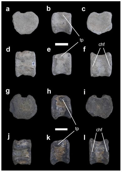 - MPA-1086 (Figure 5a–f) and MPA-653 (Figure 5g–l) are vertebral centra. Both are amphicoelous and wider than they are tall and long. The articulation facets are heart-shaped. The lateral surfaces are concave with transverse processes located in the upper half of the centrum. MPA-653 presents a deep concavity in the left lateral located immediately under the transverse process, whereas, in the right lateral, the concavity is more superficial. In ventral view, neither centra have a keel or a groove, but they do have chevron facets. The dimensions of the centra, the shape of the articular facets and the presence of transverse processes and chevron facets led us to identify them as middle caudal centra.
