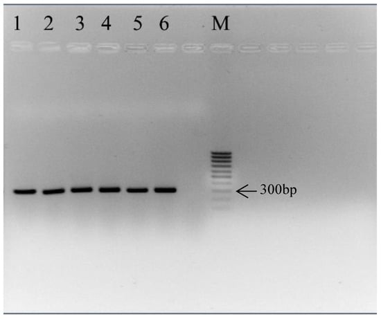 Agarose gel electrophoresis of the ITS1 region of: P. vera L., line 1 (Pver5) and line 2 (Pver7); P. terebinthus L., line 3 (Pter44) and line 4 (Pter45); and P. atlantica Desf. subsp atlantica, line 5 (PatlB4) and line 6 (PatlB7); M: Marker 100 bp ladder.