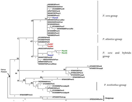 The phylogenetic tree resulting from the analysis of ITS sequences is shown in Figure 3. It can be observed that all of the samples relating to pistachio tree species are descended from a common ancestor, thus forming a monophyletic group distinct from the outgroup. In addition, P. mexicana presented as an ancient lineage in a sister position to all other pistachio trees. The latter form a large monophyletic group which is well-supported by ITS1, with 93% bootstrap. This large group diversified from a common ancestor into three divergent evolutionary lines equidistant from each other (polytomy) represented by clades A, B and C (Figure 3). Despite having a significant number of informative sites for the genus, these three clades did not present bootstraps values higher than 70, although the synapomorphies were significant in two of the three groups (with values of 3 and 10). All of our newly sequenced samples (coloured blue for P. vera L., green for P. terebintus L., and red for P. atlantica Desf.) were included in a monophyletic group, clade C, which is mainly composed of all samples of P. vera L., including cultivars, P. atlantica Desf., their hybrids and those of P. terebinthus L. This line C has itself diversified into three subclades, c1, c2 and c3, the latter showing the highest divergence (three synapomorphies and a bootstraps value greater than 70) from the other two. The two individuals of the local population of Atlas pistachio of Batna (PatlB4, PatlB7) position themselves unambiguously with the three reference sequences of P. atlantica Desf. Hence, they form a monophyletic subgroup (c2) of various origins, distributed from Asia to the Mediterranean region []. This confirms the taxonomic identification of our PatlB4 and PatlB7 samples. Moreover, it is highly interesting to note that this subgroup c2, although it is not robustly distinguishable not only from the samples of P. vera L. and P. terebinthus L. that we obtained from the Botanical Garden of Padova (Italy), but also from the few individuals of GenBank identified with hybrids of P. atlantica Desf. and P. vera L., which are positioned with P. vera L. samples in subgroups c1 and c3. Concerning the two P. vera L. samples from the Botanical Garden of Padova, it is conspicuous that they are clearly distinguished from each other; one relates to subgroup c1 (Pvera7) and the other to c3 (Pvera5). Finally, as demonstrated on the tree, the two samples, Pter44 and Pter45, belong to the same lineage (P. terebinthus L.) within subclade c1, where it is surprisingly positioned as a sister species to Pvera7, and not in clade A with other P. terebinthus L. specimens.