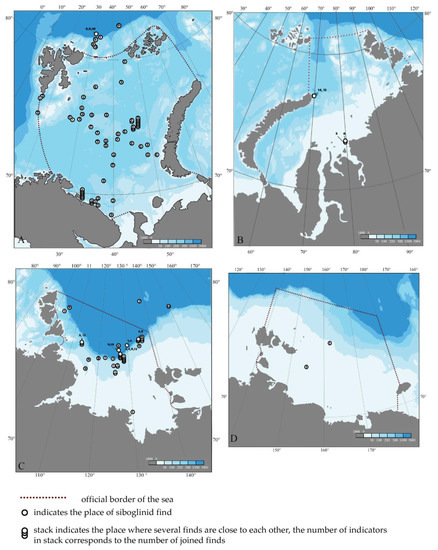 Distribution maps of siboglinid records in the Arctic seas of Russia. (A)—the Barents Sea, (B)—the Kara Sea, (C)—the Laptev Sea, (D)—the East Siberian Sea. The numbers indicate the records of the following siboglinid species: 1—Oligobrachia haakonmosbiensis, 2—Nereilinum murmanicum, 3—Nereilinum squamosum, 4—Polarsternium rugellosum, 5—Crispabrachia yenisey, 6—Galathealinum karaense, 7—Polybrachia gorbunovi, 8—Siboglinum ekmani, 9—Siboglinum hyperboreum, 10—Siboglinum norvegicum, 11—Siboglinum sp., 12—Sclerolinum contortum, 13—Siboglinidae sp. 1, 14—Siboglinidae sp. 2, 15—Siboglinidae sp. 3.