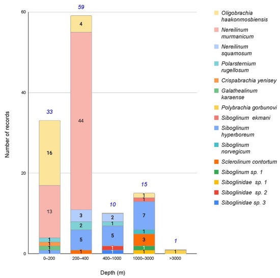 Distribution of siboglinid records by depth. The numbers indicate the number of records at a given depth range. The number of records of the corresponding species are indicated in black; the total number of siboglinid finds of the current depth range is indicated in blue italics.