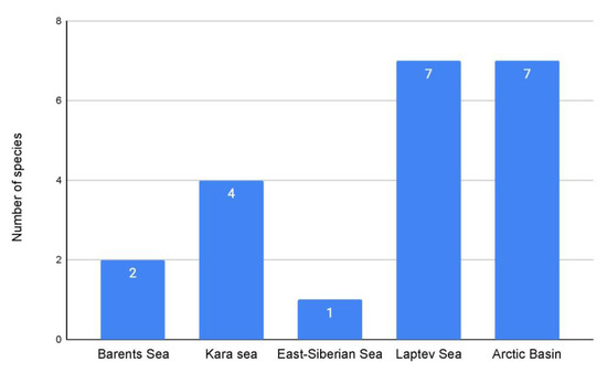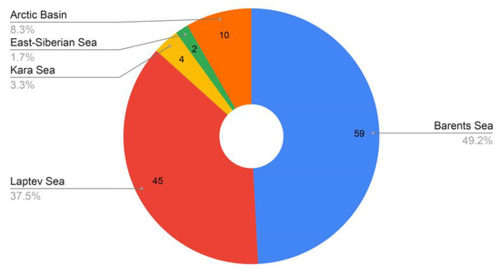 The total number of siboglinid records in the Arctic seas of Russia and the adjacent sector of the central basin of the Arctic Ocean is 120. The largest number of records (59) falls on the Barents Sea (49.2%), followed by the Laptev Sea (45; 37.5%) (Figure 3). The Kara Sea accounts for 3.3% of the records, and the East Siberian Sea accounts for 1.7% (Figure 3).