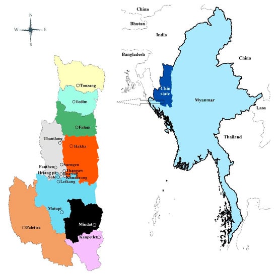 The study site was in the Chin State (22°0′31.31″ N, 93°34′52.57″ E), the western part of Myanmar. The state is the most ethnically diverse area in Myanmar []. It is bordered by Bangladesh to the southwest, the Indian states of Mizoram to the west, Manipur in the north, Myanmar’s Sagaing Region and Magway Region to the east, and Rakhine State to the south (Figure 1). Most of the state is mountainous, and peaks can reach up to 3000 m above sea level (i.e., Nat-Ma-Taung National Park) [,]. The landscape forms part of the Chin Hills’ warm temperate rainforest ecosystem [,], which is composed of a humid warm temperate and evergreen subtropical moist broadleaf forest and is home to many Himalayan species as well as many endemics [].
